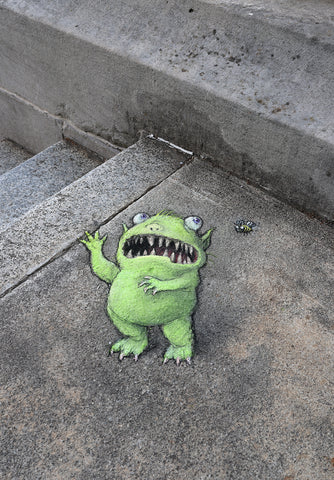 Als David Zinn door de stad loopt ziet hij altijd wat. Een stukje kauwgom, een scheur in de straat of een rare plekje. Zo ontstaan zijn kunstwerken. Een metalen dekseltje wordt een pot met een monster er in. Vier puntjes worden twee ogen en een mond van een groen monstertje. Hij ziet iets, wat anderen niet zien.